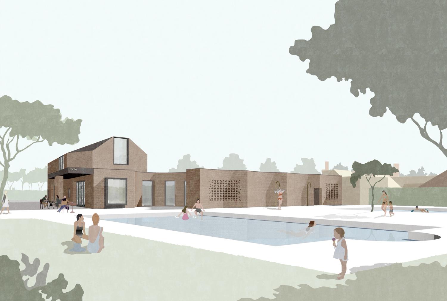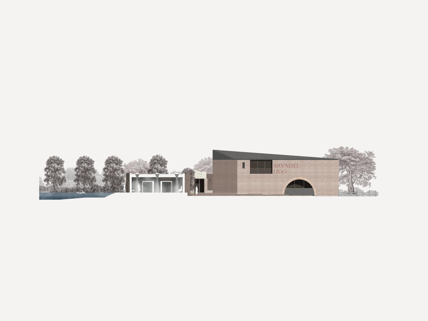 ARA won an invited competition to design new facilities at Arundel’s lido, which has been operating since the 1960s. It has a spectacular site in the crook of the river Arun, looking up at Arundel Castle. The brief called for changing rooms, a café, a gym and a public room. An L-shape in plan, it creates a new space for public events in the car park. The discovery of a Roman villa in Arundel was the starting point for our design, which draws on the history of bathhouses from antiquity.