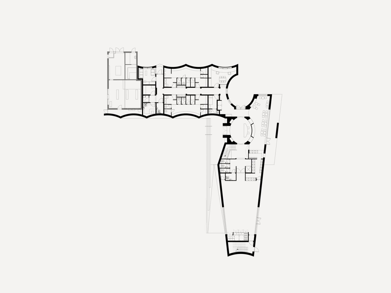The top-lit, single-storey changing rooms have brick walls that ripple as if seen through water, whilst the two-storey wing containing the ‘civic’ spaces points like an arrow from town to open country. The entrance lies in the crook of these two wings, and leads into a series of elliptical spaces, conceived as a fragmentary baroque progression from a top-lit stair to the gym, and out to the pools. These warm, enveloping spaces embrace the human form in varying degrees of undress through the year.