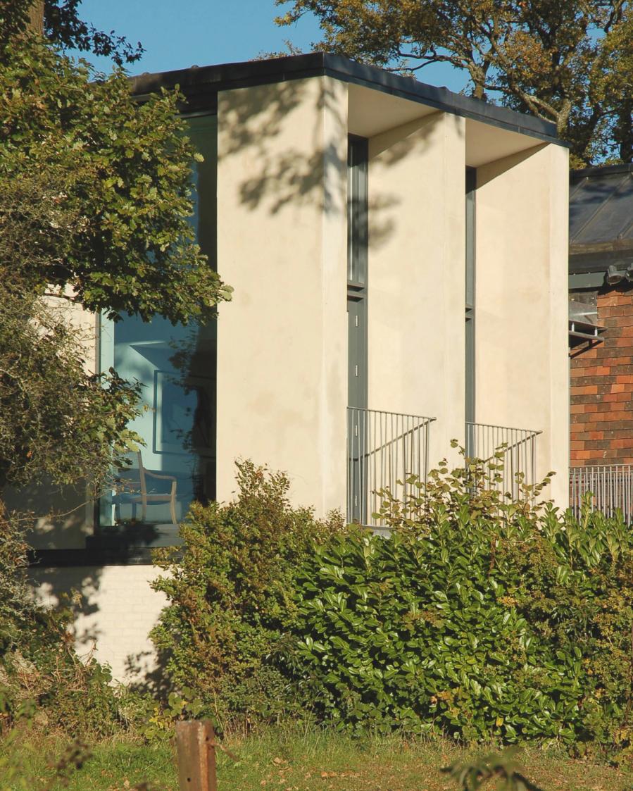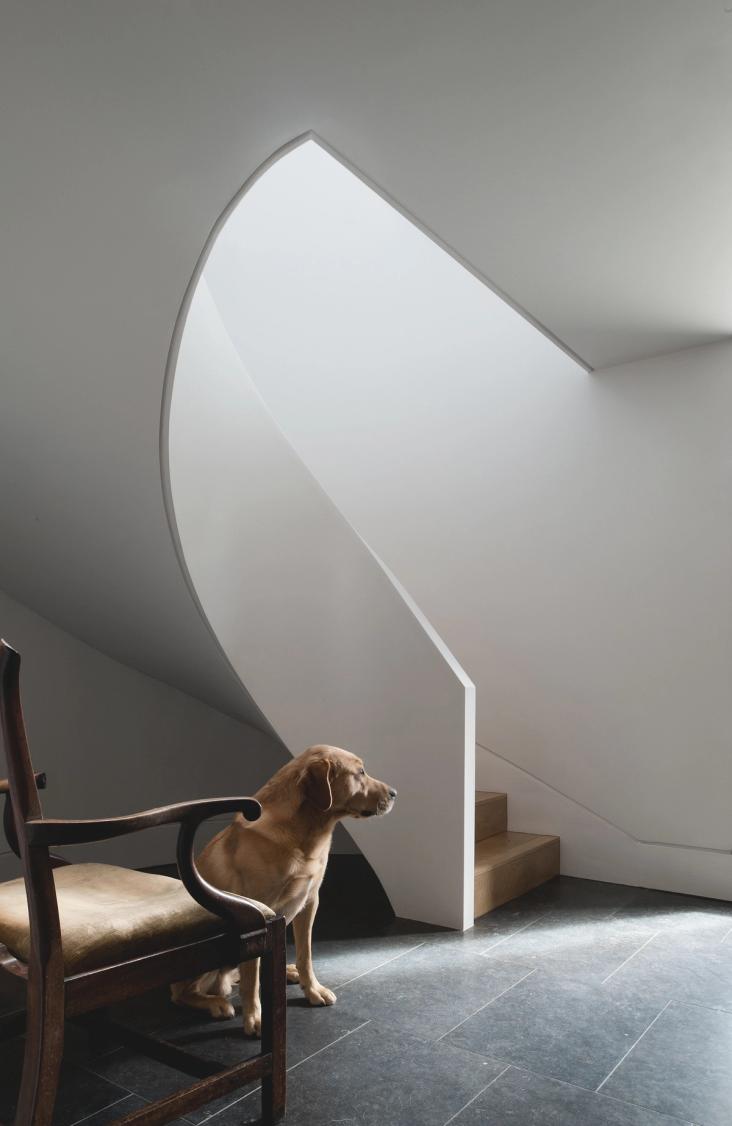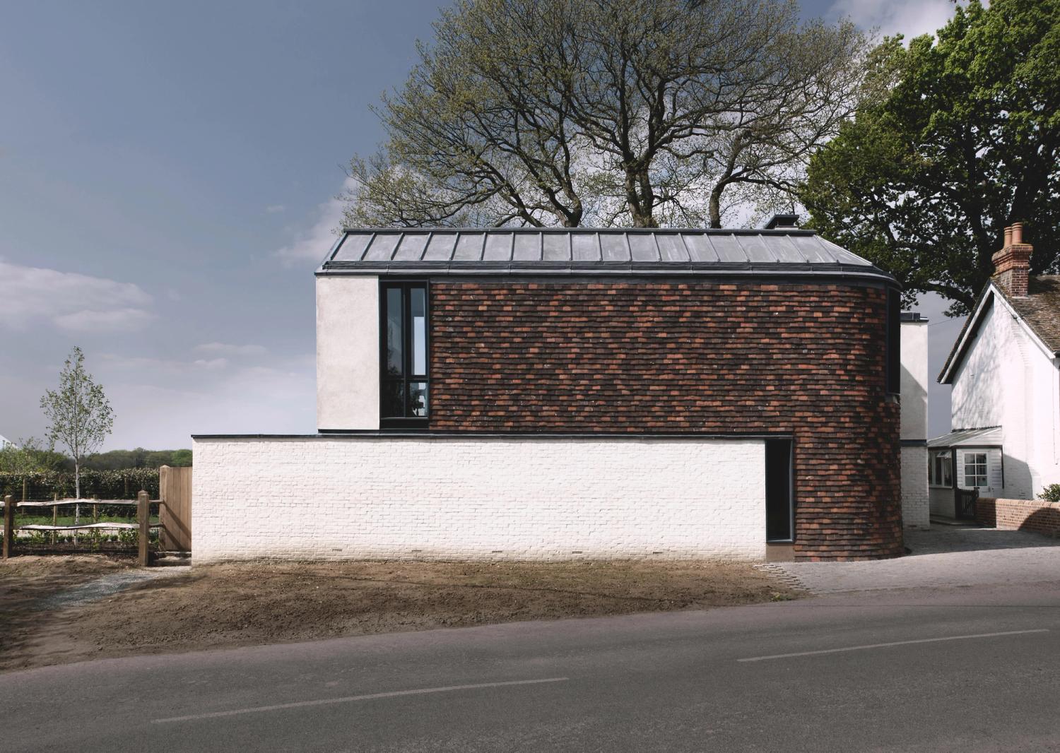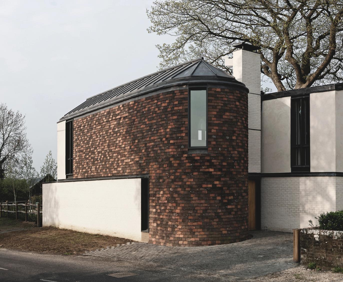 Contemporary versions of a classical temple and a Gothic chapel fight it out on a brick plinth, against the backdrop of Blackdown in West Sussex. Bedrooms are on the ground floor, with living spaces above to enjoy long views over open country. The introverted, chthonic ground floor, dark with oak and black stone, contrasts with the light, abstraction and vistas of the living space above. The first floor spaces are further subdivided by two pieces of walnut built-in furniture. Taking the form of scale models of their respective halves of the building, they act as screens and backdrops to the kitchen & study respectively.