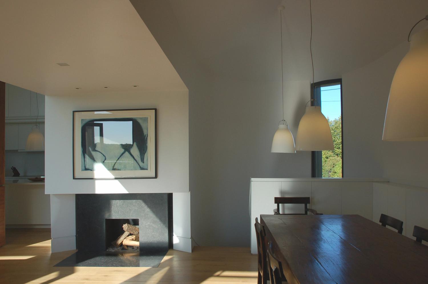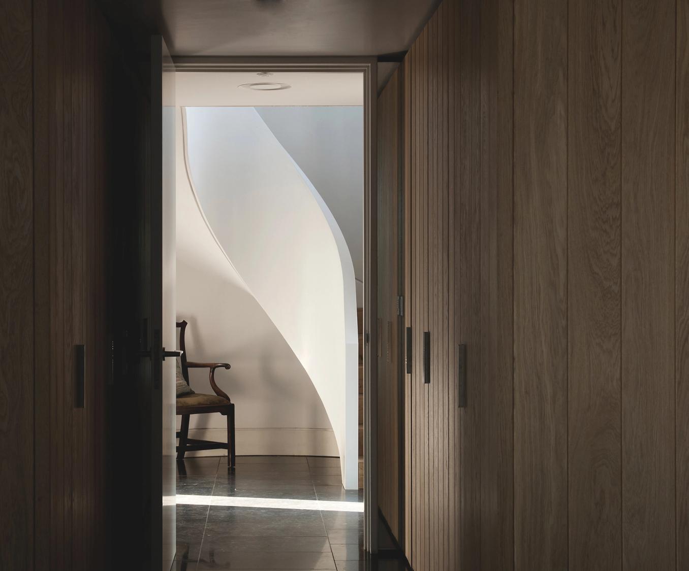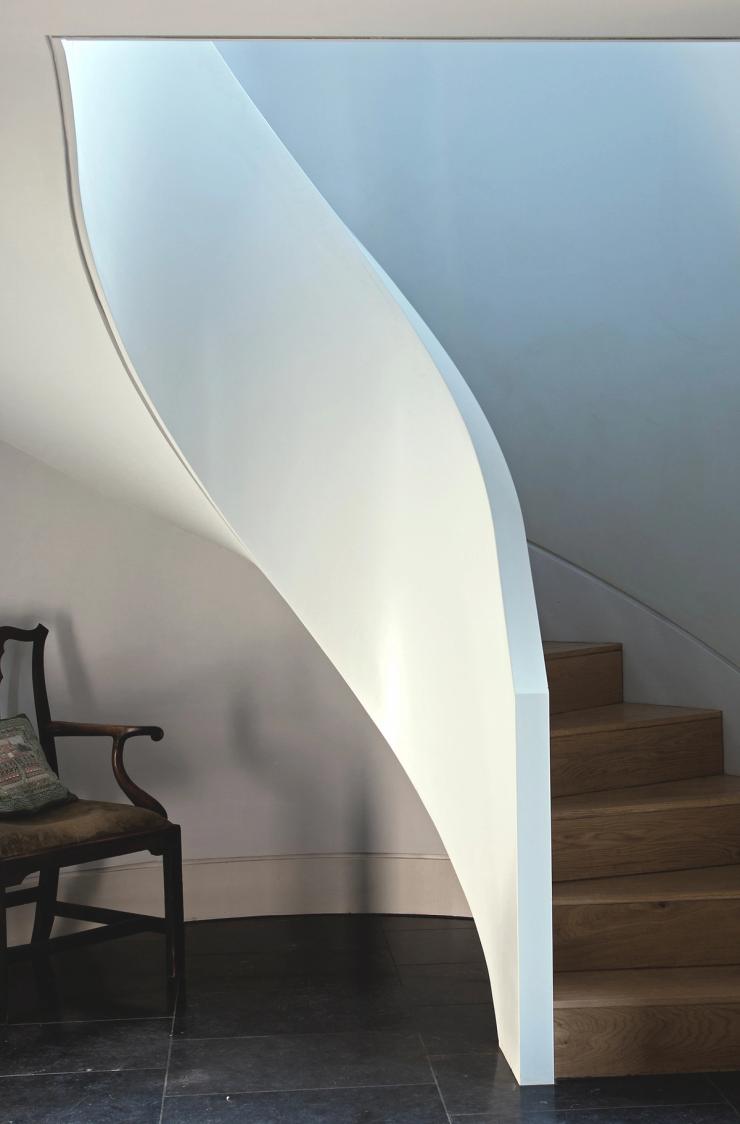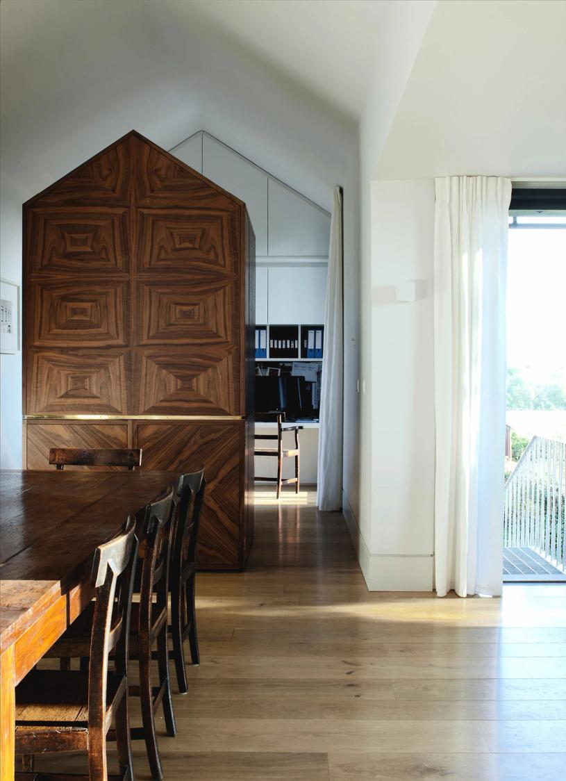 Contemporary versions of a classical temple and a Gothic chapel fight it out on a brick plinth, against the backdrop of Blackdown in West Sussex. Bedrooms are on the ground floor, with living spaces above to enjoy long views over open country. The introverted, chthonic ground floor, dark with oak and black stone, contrasts with the light, abstraction and vistas of the living space above. The first floor spaces are further subdivided by two pieces of walnut built-in furniture. Taking the form of scale models of their respective halves of the building, they act as screens and backdrops to the kitchen & study respectively.
