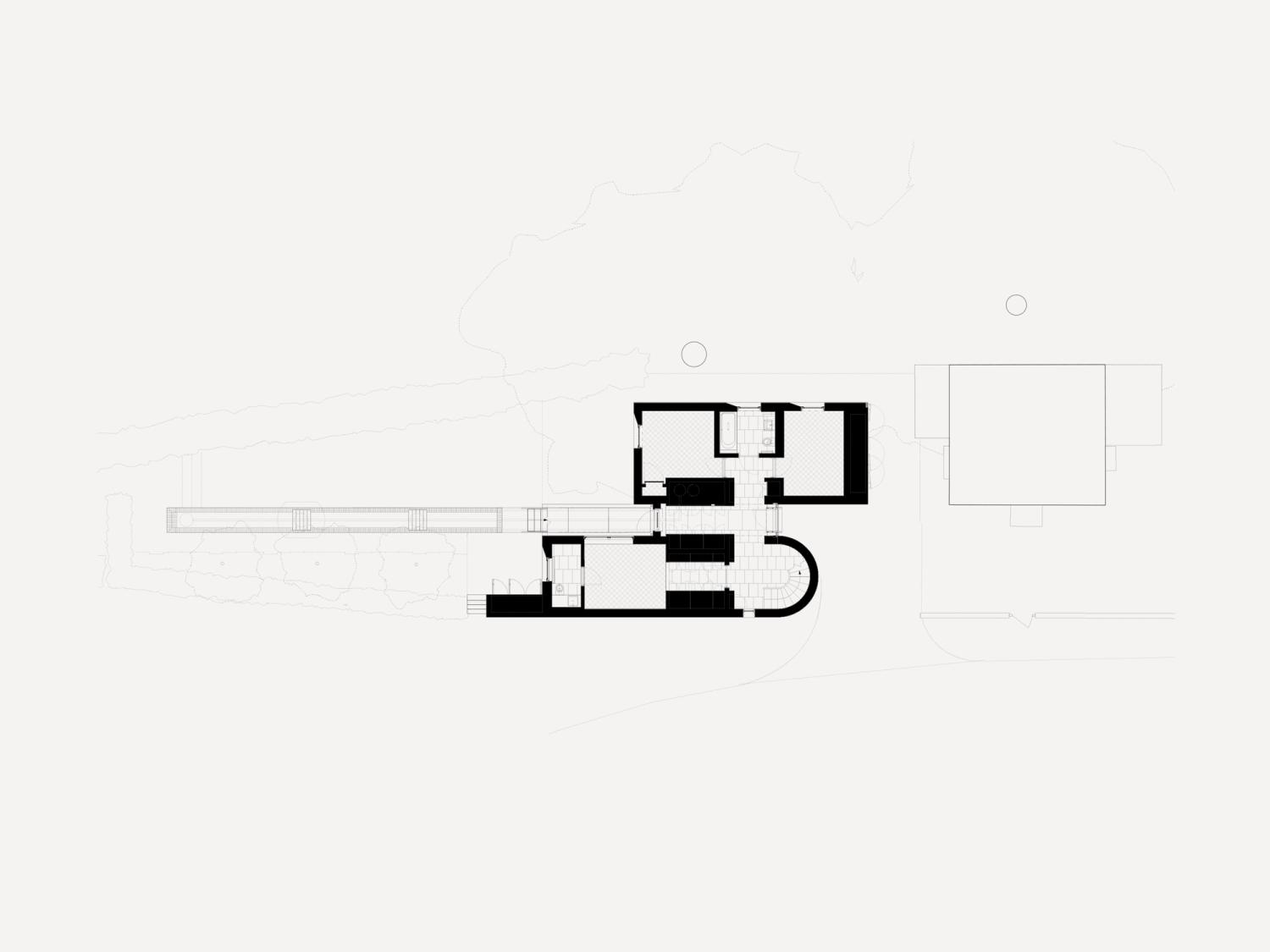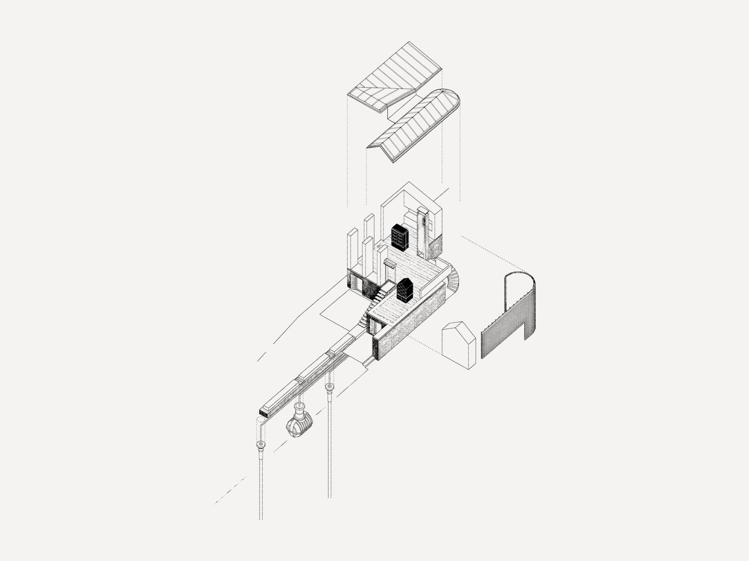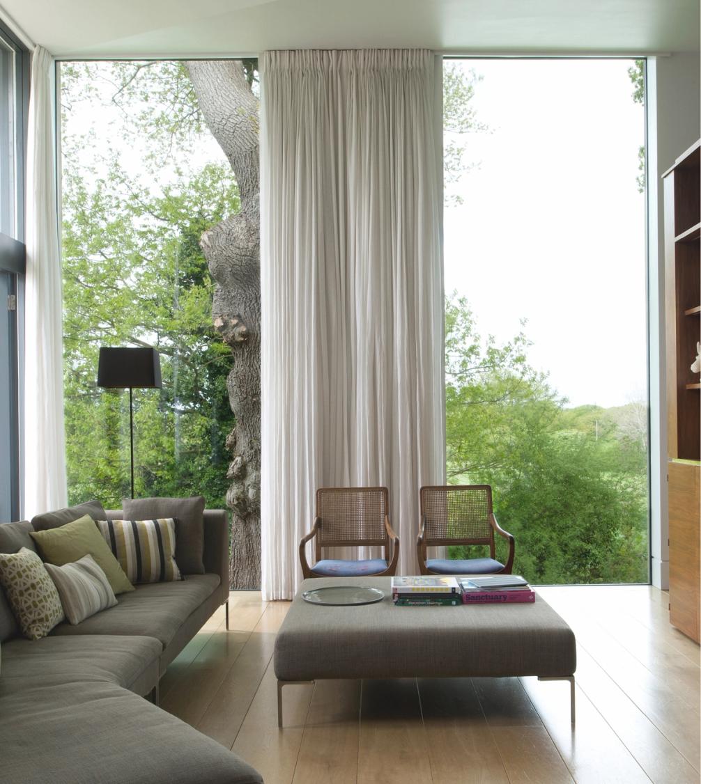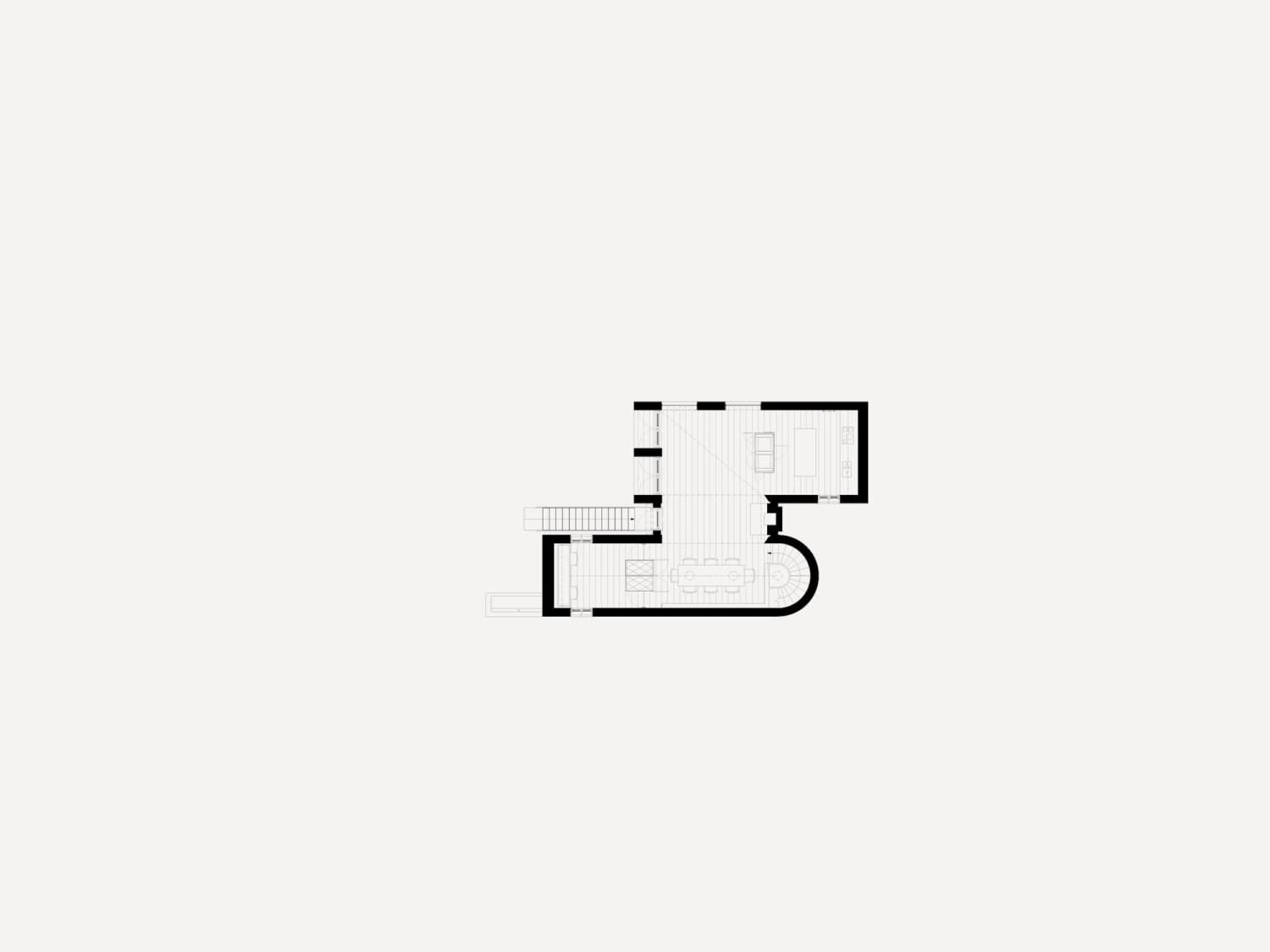 Contemporary versions of a classical temple and a Gothic chapel fight it out on a brick plinth, against the backdrop of Blackdown in West Sussex. Bedrooms are on the ground floor, with living spaces above to enjoy long views over open country. The introverted, chthonic ground floor, dark with oak and black stone, contrasts with the light, abstraction and vistas of the living space above. The first floor spaces are further subdivided by two pieces of walnut built-in furniture. Taking the form of scale models of their respective halves of the building, they act as screens and backdrops to the kitchen & study respectively.