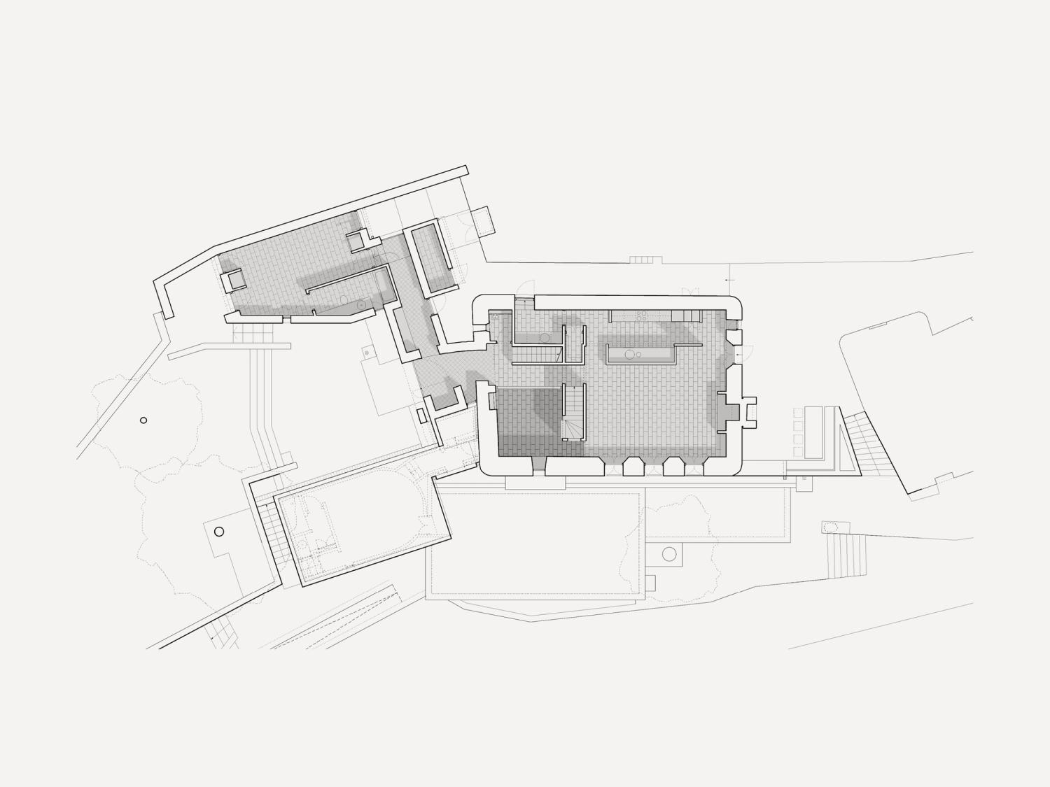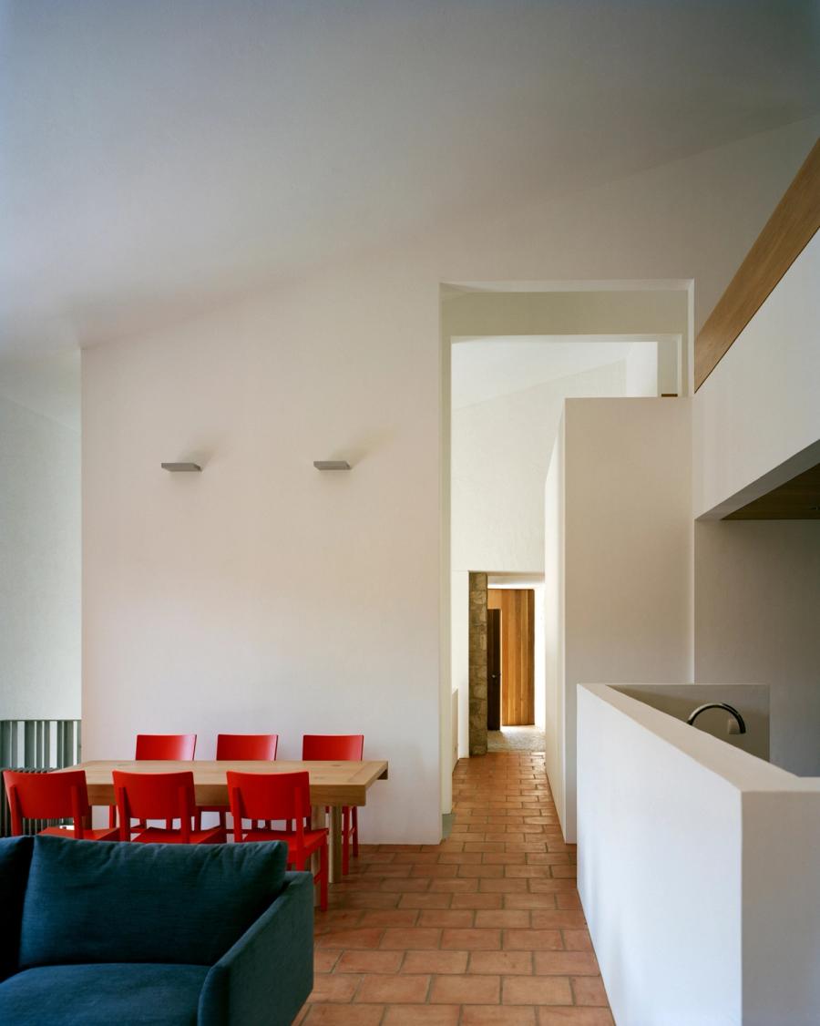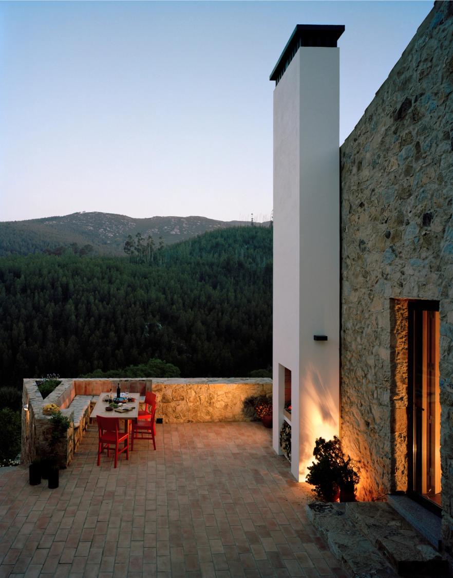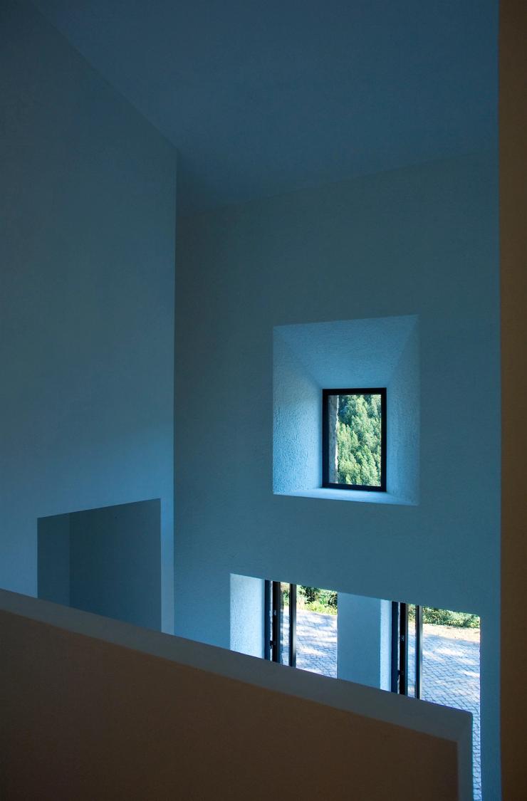 New wings spin out from this box, enclosing bedrooms and defining courtyards. Within the main stone building, two overlapping staircases forming a cross-shape in plan define different sized spaces that contain the principal activities: for living, dining, cooking and reading. The house culminates in an over-scaled chimney, emphasizing the symbolism of the hearth, and setting its face against the harsh mountain weather. As with many of our projects, Quinta da Serra represents an engagement with local vernacular architecture, transforming it into something new.