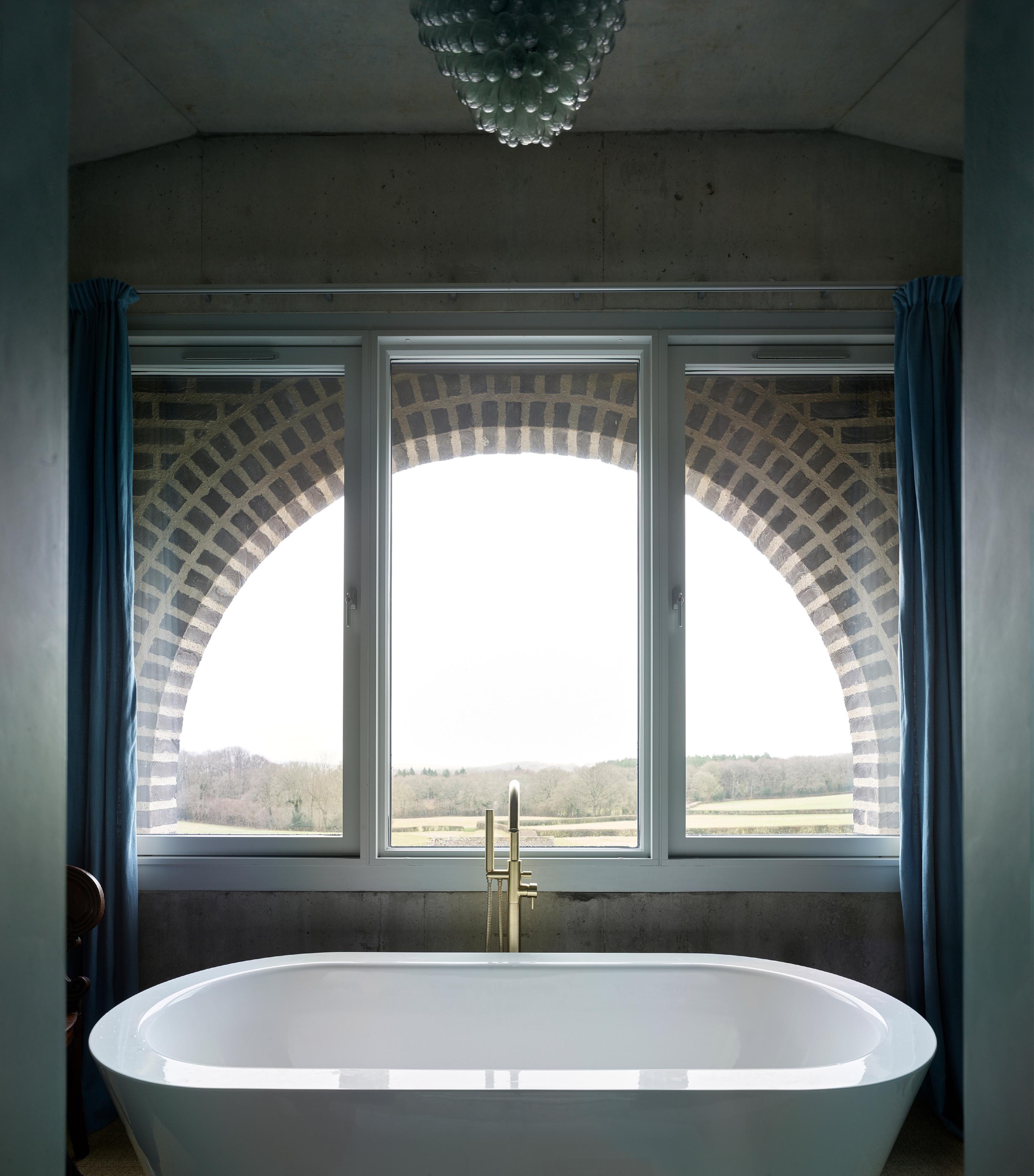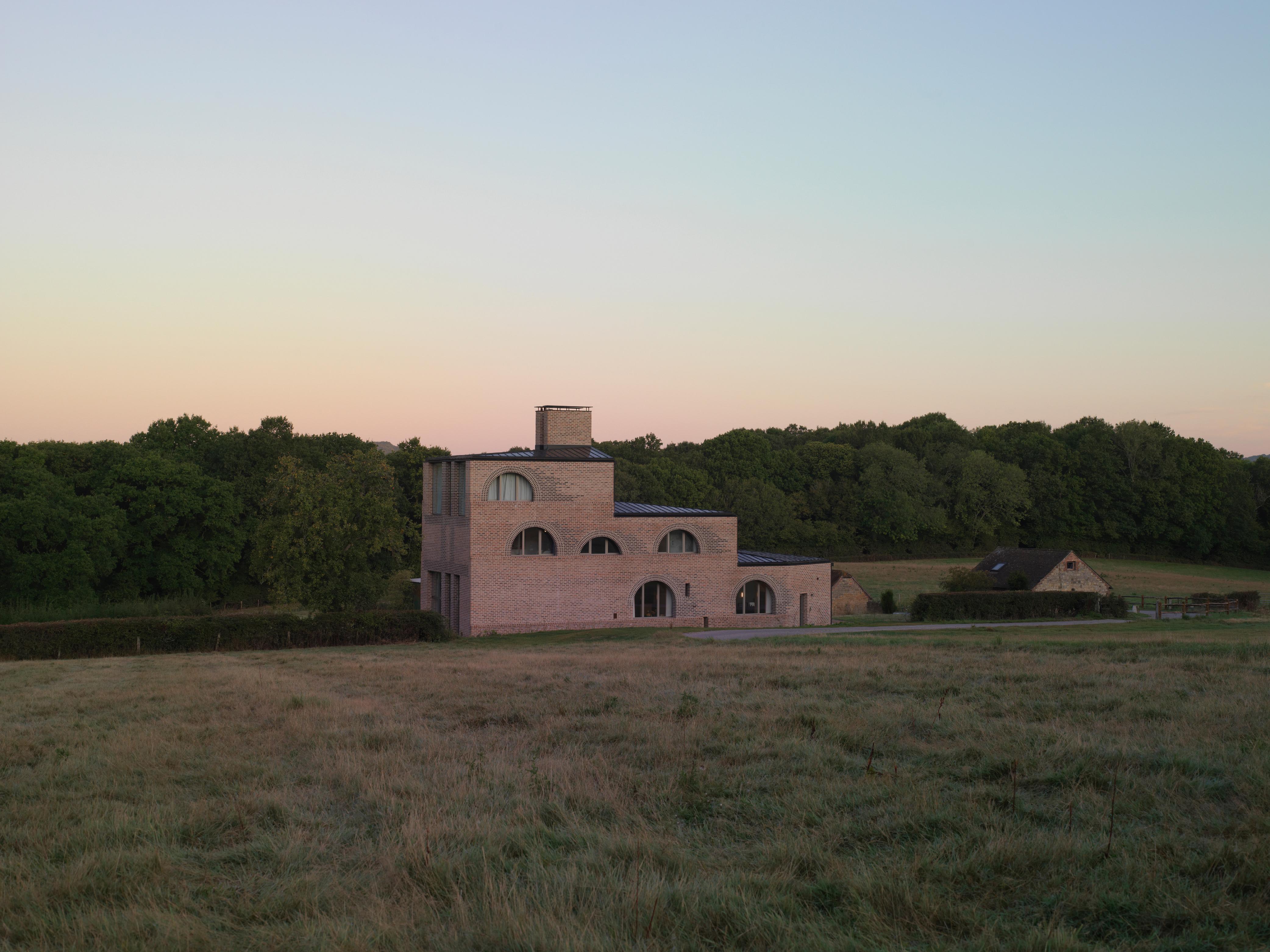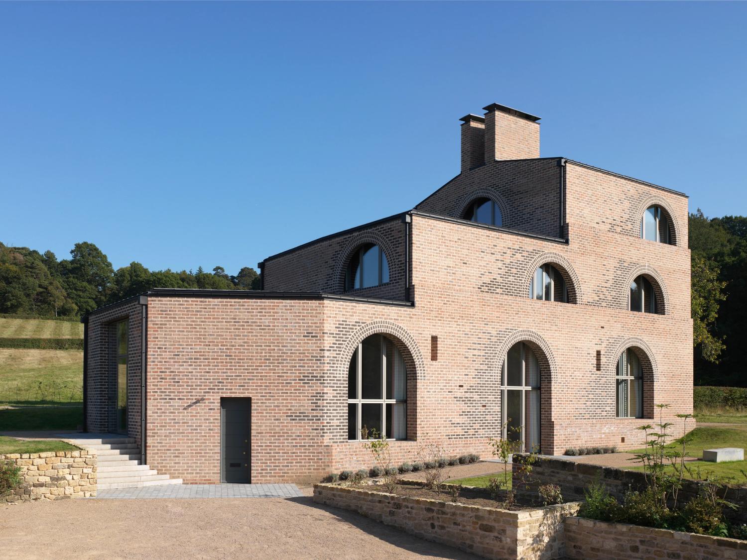 Nithurst Farm is a new-build family home for the architect and his family in the South Downs National Park. The house is built from structural concrete and wrapped in a thick brick skin. Arched brick window openings give ‘cadence’ to the long side elevations. The backs of these arches are visible from within the house, differentiating the inner and outer leaves. By contrast, the south elevation rises to form a 3 storey tower, expressed as a grid.