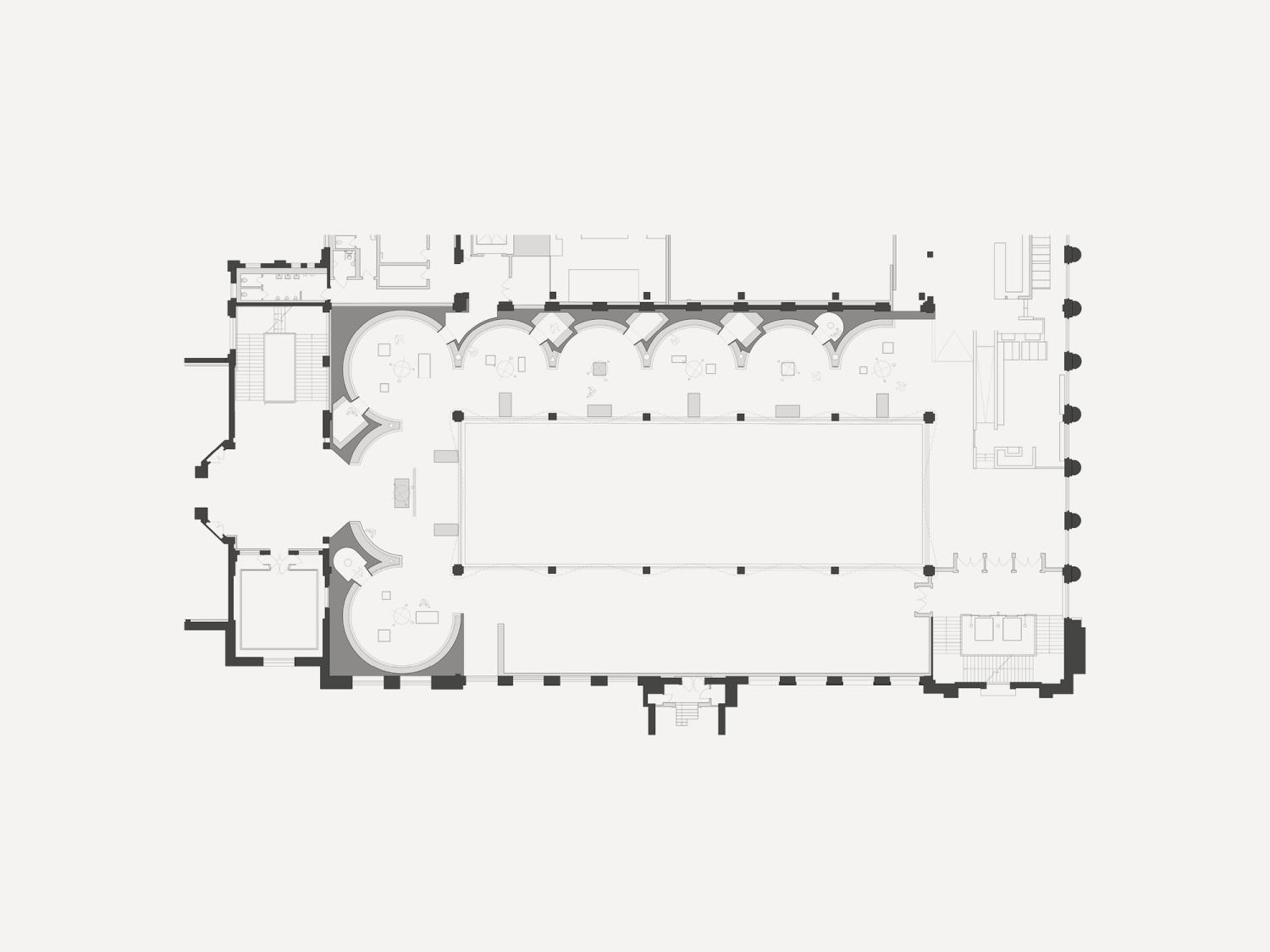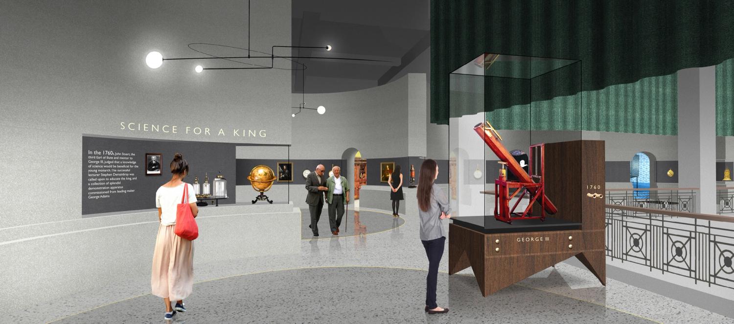 So we proposed structuring the gallery as though it were a fragment of a vast baroque building. Following the rhythm of the existing gallery, the layout consists of a series of repeating semi-circular bays opening onto the Science Museum’s atrium. These bays have a band of display cases containing the exhibits, with free standing objects in cases structuring the space between the bays and the atrium edge.