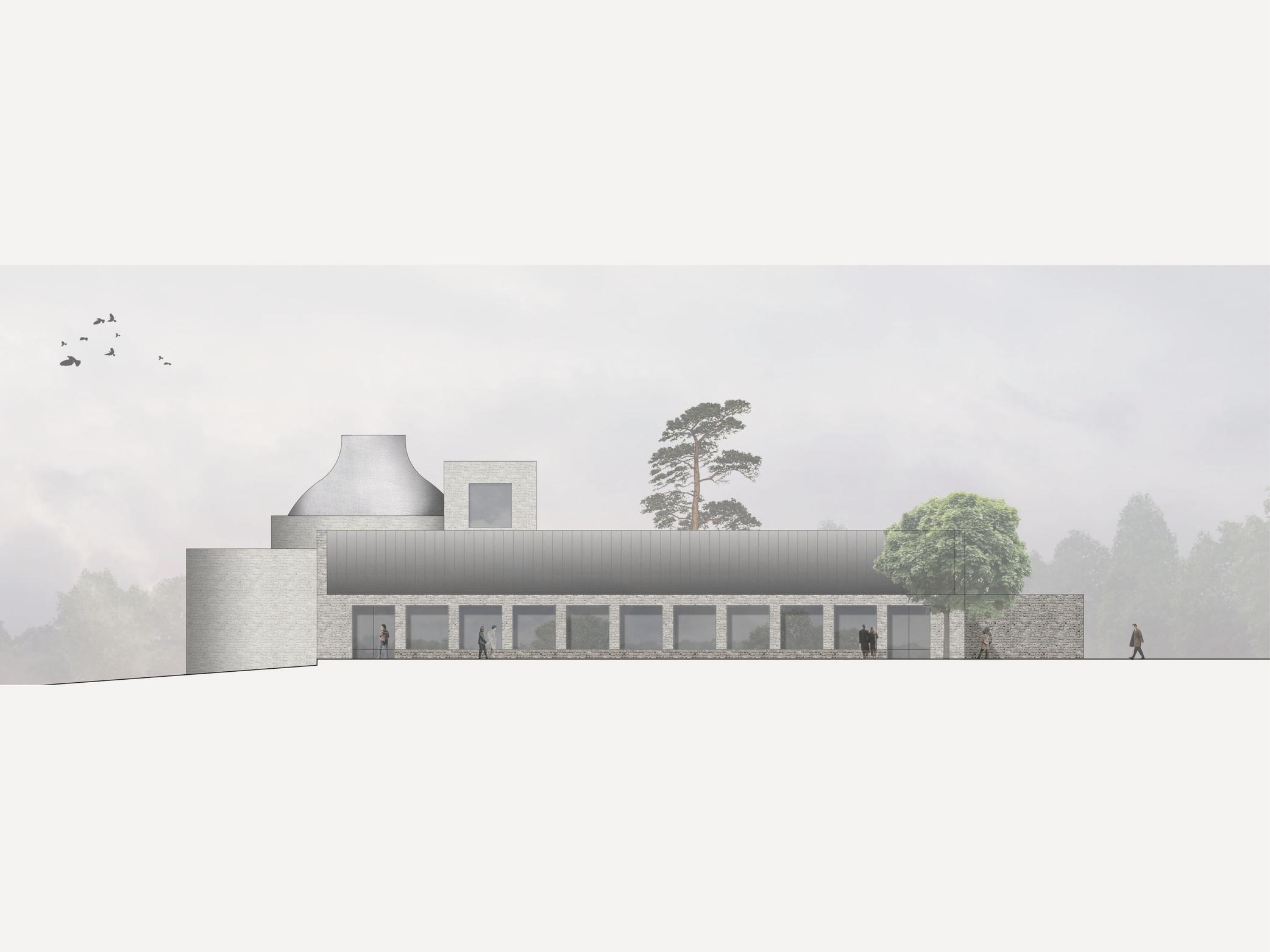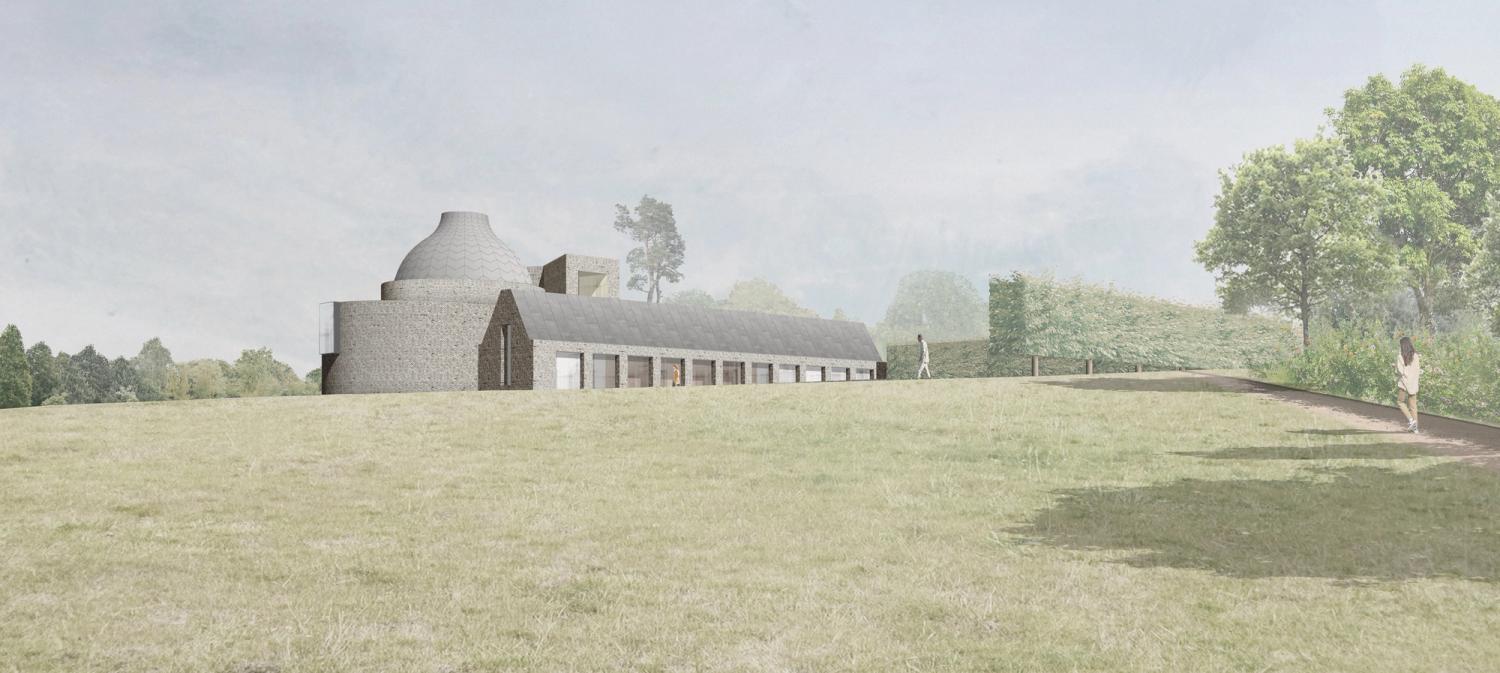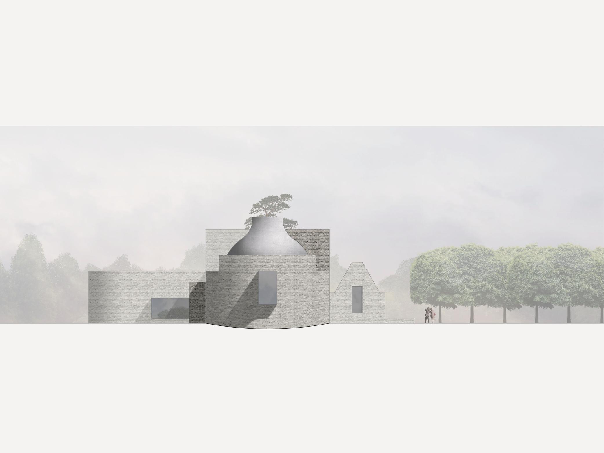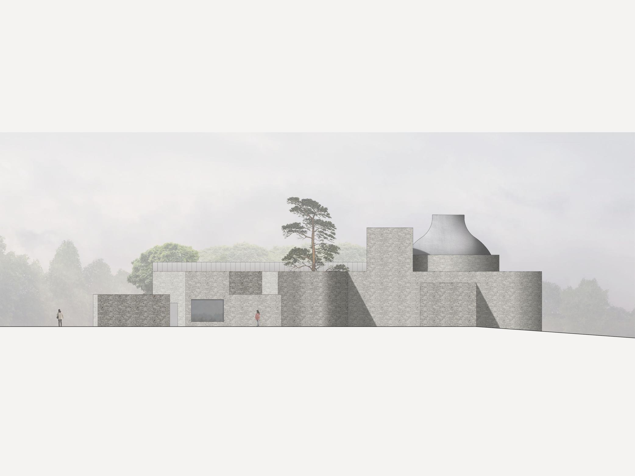 A key structuring device is a square entrance garden that acts as a fragment of a cloister: one side of this cloister is formed by a long colonnaded foyer building - at one end this gives access to the temple, at the other it contains the social spaces. A ceremonial ‘pilgrimage’ route leads through lecture rooms and through the library, before passing between two chapels into the temple. This route circulates around a small inner court with single Scots pine, orienting people first to the landscape, and then to the axis-mundi of the temple. The circular temple has a dome with an oculus, its shape based on a 1950s stoneware vase by the Danish potter Eva Staehr-Nielsen.