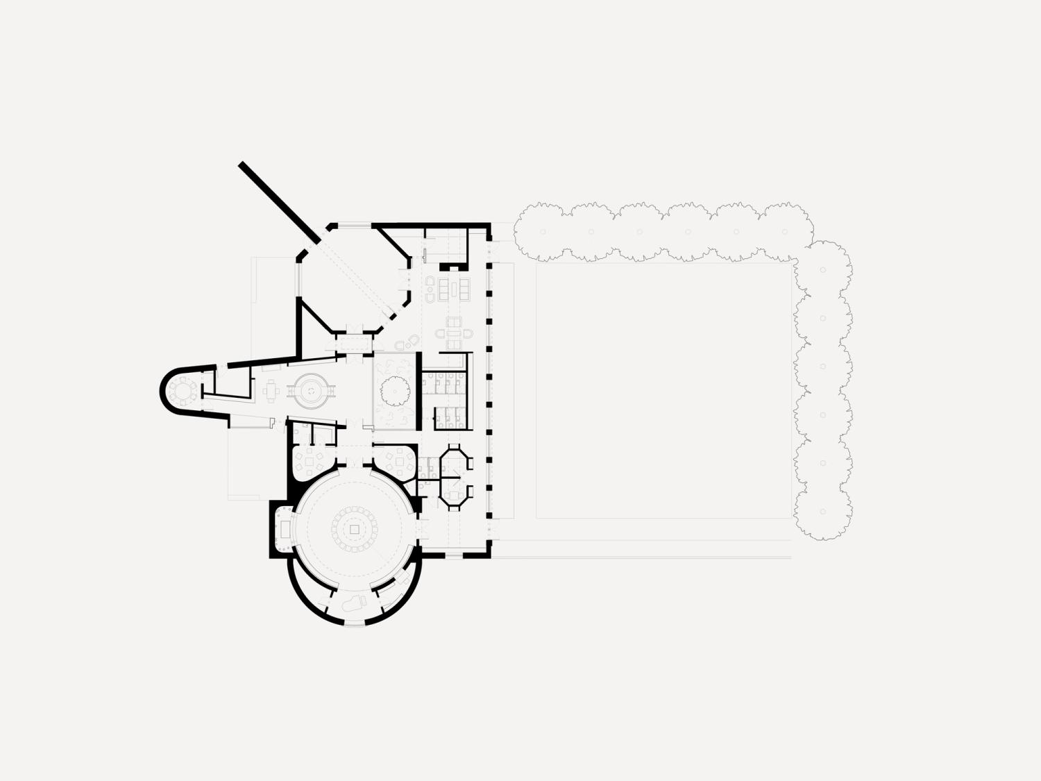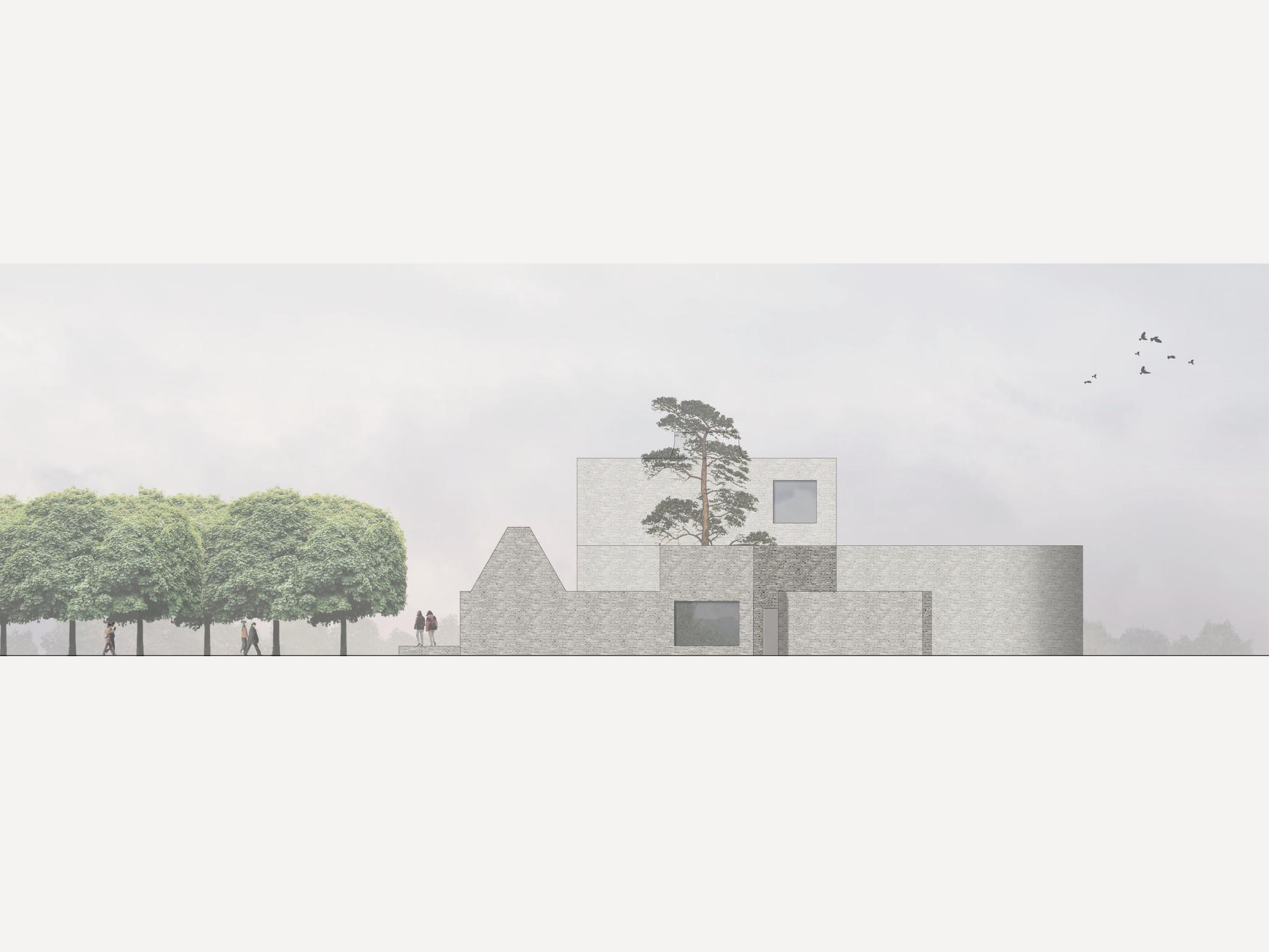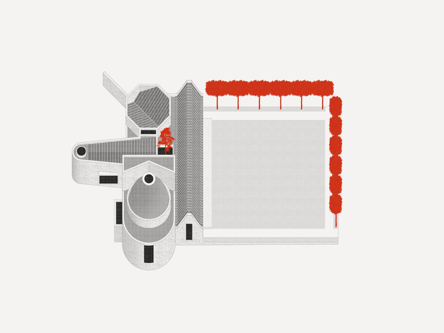 A key structuring device is a square entrance garden that acts as a fragment of a cloister: one side of this cloister is formed by a long colonnaded foyer building - at one end this gives access to the temple, at the other it contains the social spaces. A ceremonial ‘pilgrimage’ route leads through lecture rooms and through the library, before passing between two chapels into the temple. This route circulates around a small inner court with single Scots pine, orienting people first to the landscape, and then to the axis-mundi of the temple. The circular temple has a dome with an oculus, its shape based on a 1950s stoneware vase by the Danish potter Eva Staehr-Nielsen.