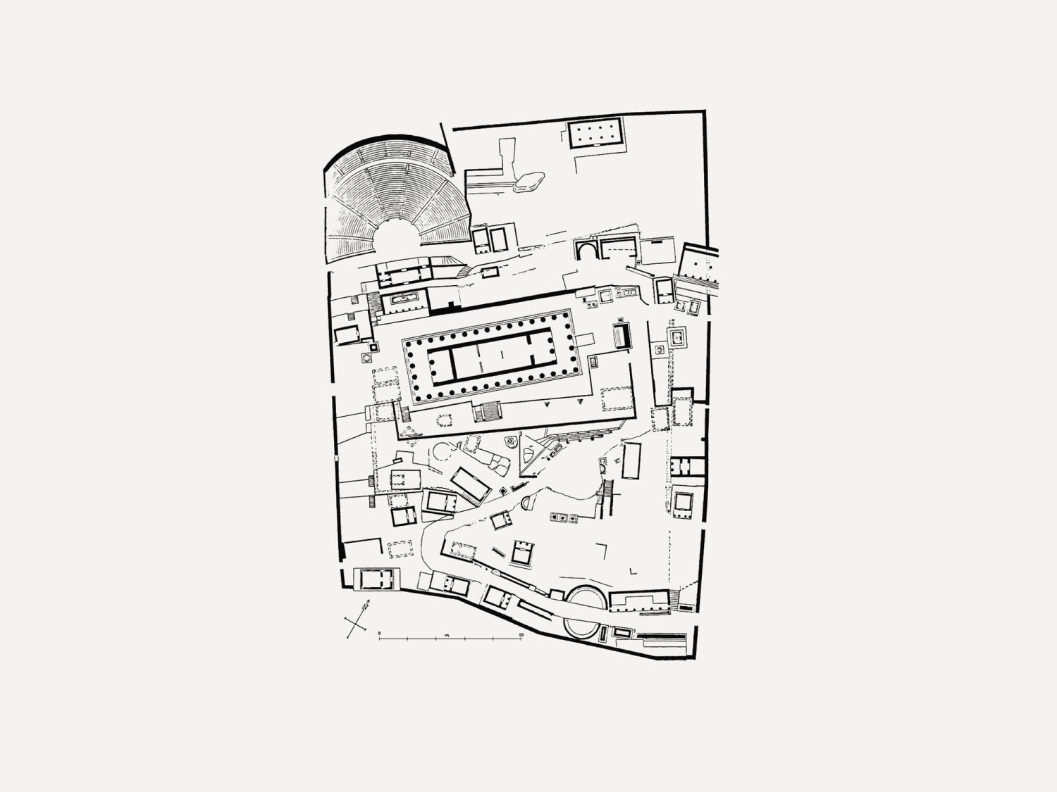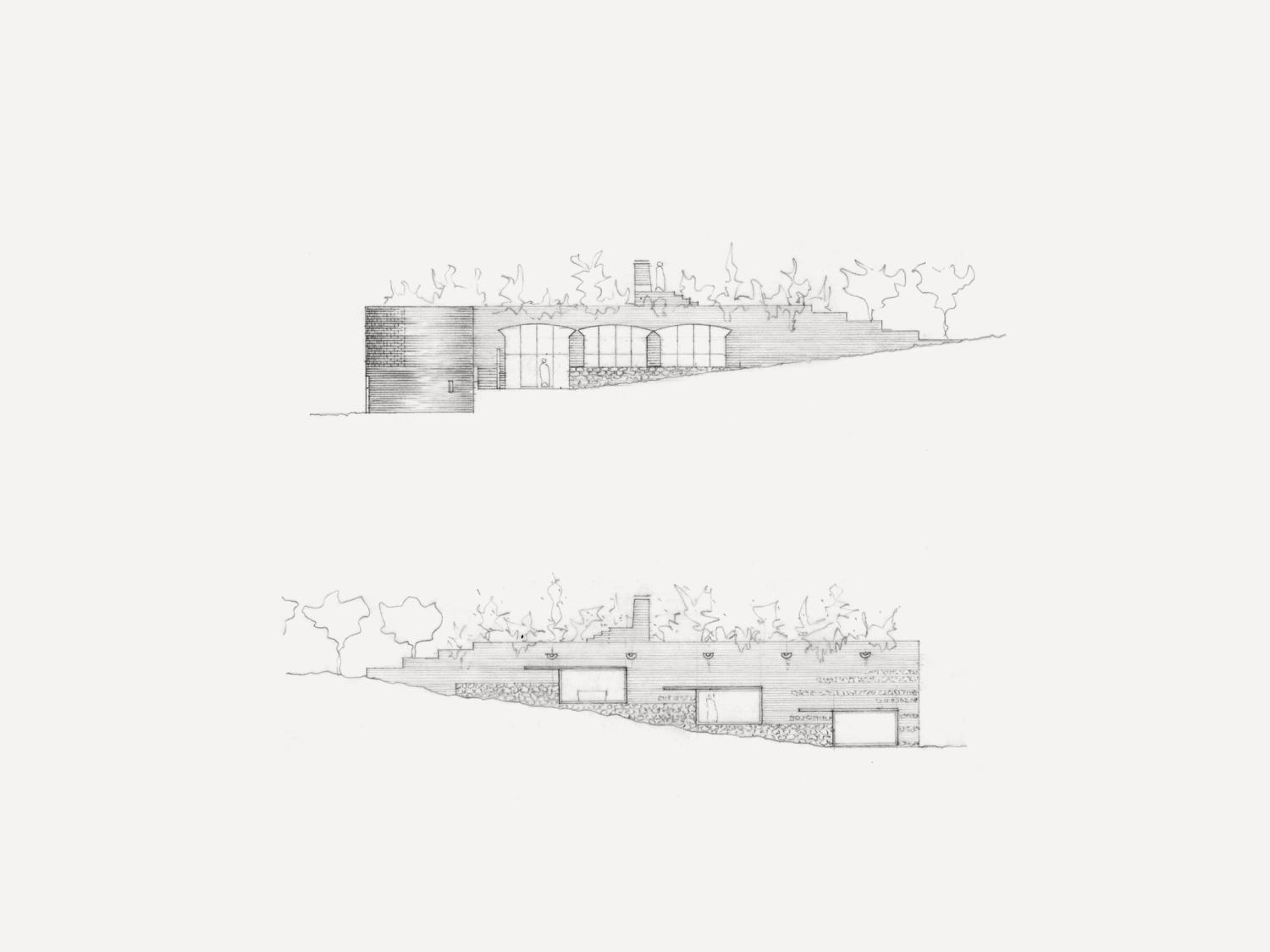 The site for this project is a south-facing slope, surrounded by trees and with distant views of the South Downs. A restored glasshouse dominates the top of the site: a destination. Rather than placing a building in the middle of the roughly rectangular plot, the decision was made to create a kind of walled garden to embrace the glasshouse, and for the new building to form one wall of that garden. This strategy allows the garden to be understood as a version of an ancient Greek ‘temenos’ – a special realm. The intention is for the garden to be planted with radiating curving lines of lavender: a tilted geometric plane addressing the skies and suggestive both of a labyrinth and of an ancient Greek theatre.