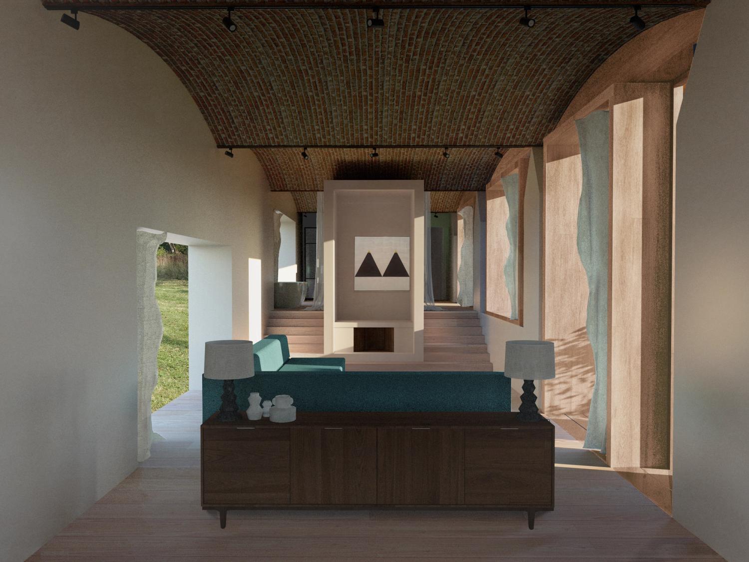 The new building consists of a long 5m wide rectangular bar running up the hill, anchored by a circular drum at the foot of the slope. Built from reclaimed brick, the buildings are an echo of the oast house that previously occupied the site. Entry is by a small door at the base of the drum. A low ceilinged, labyrinthine space inside the drum leads into the main rectangular element. This main space is articulated as a giant staircase, following the slope of the hill. Steps the full width of the interior link together three level platforms, all of which are covered by the same high-level vaulted ceiling. The brick vaults of this ceiling support a roof garden above, and give a sense of rhythm and movement to the space. The lowest platform is a high-ceilinged, introverted space, the middle platform opens out through tall doors into the walled garden, whilst the top platform affords long views back through the space and out towards the distant South Downs through a vast high-level window. Large sliding windows introduce west light.