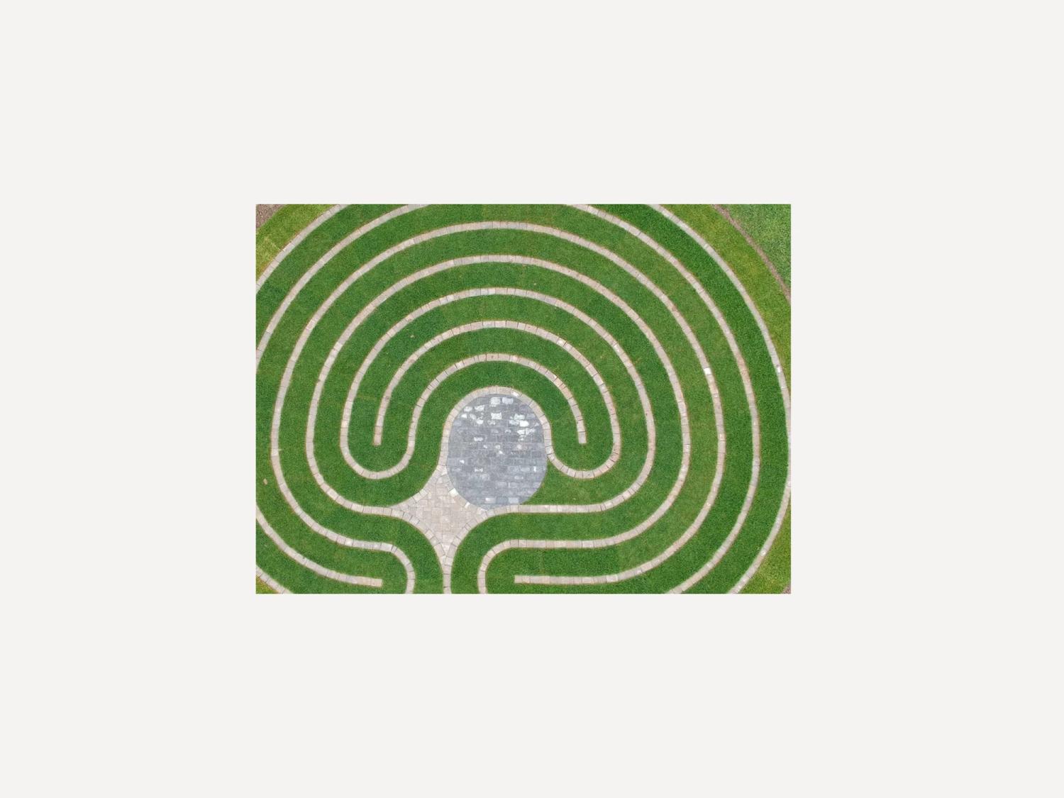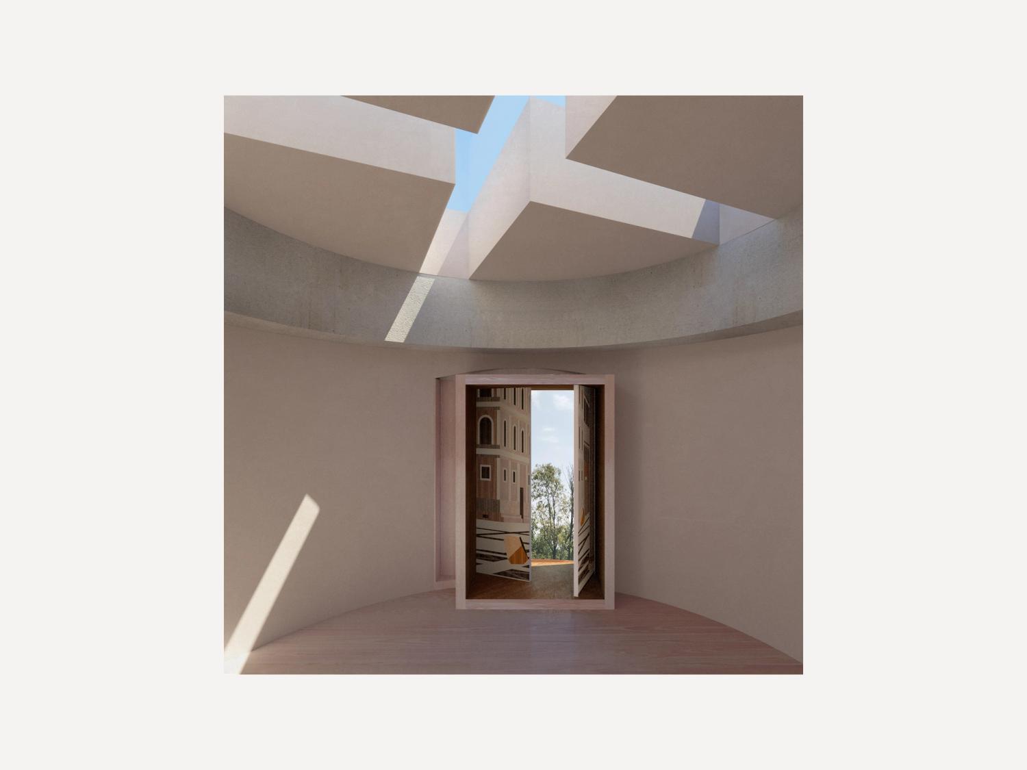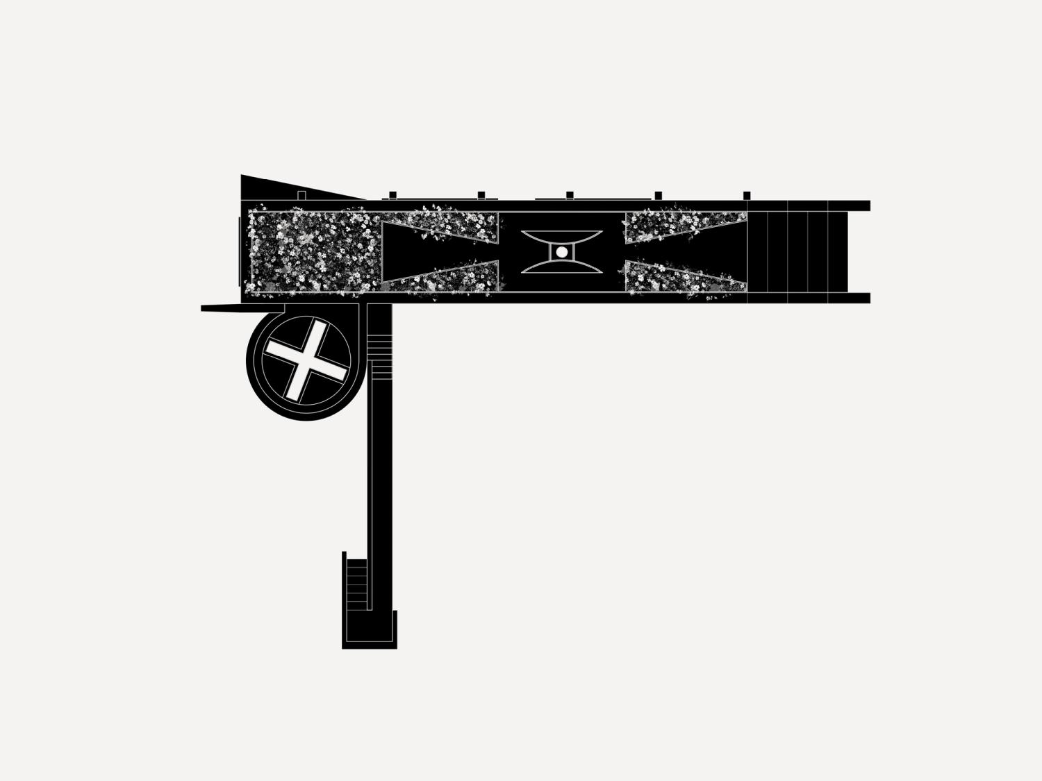 A serpentine route through the garden leads to a separate studio space in the upper floor of the brick drum - a version of Montaigne’s tower study. A cruciform skylight tracks the path of the sun, and a window with shutters filters light and views. A ‘squint’ gives a hidden glimpse into the long main space below. Leaving this studio and continuing through the lavender beds, the route leads up to the glasshouse, and on to the biodiverse roof garden of the new building. Amidst the dense foliage of the roof garden, two curved bench-backs in rusty corten steel suggest a decaying movie billboard, or the abandoned hardware of Tarkovsky’s ‘Zone’ in his masterpiece, Stalker.